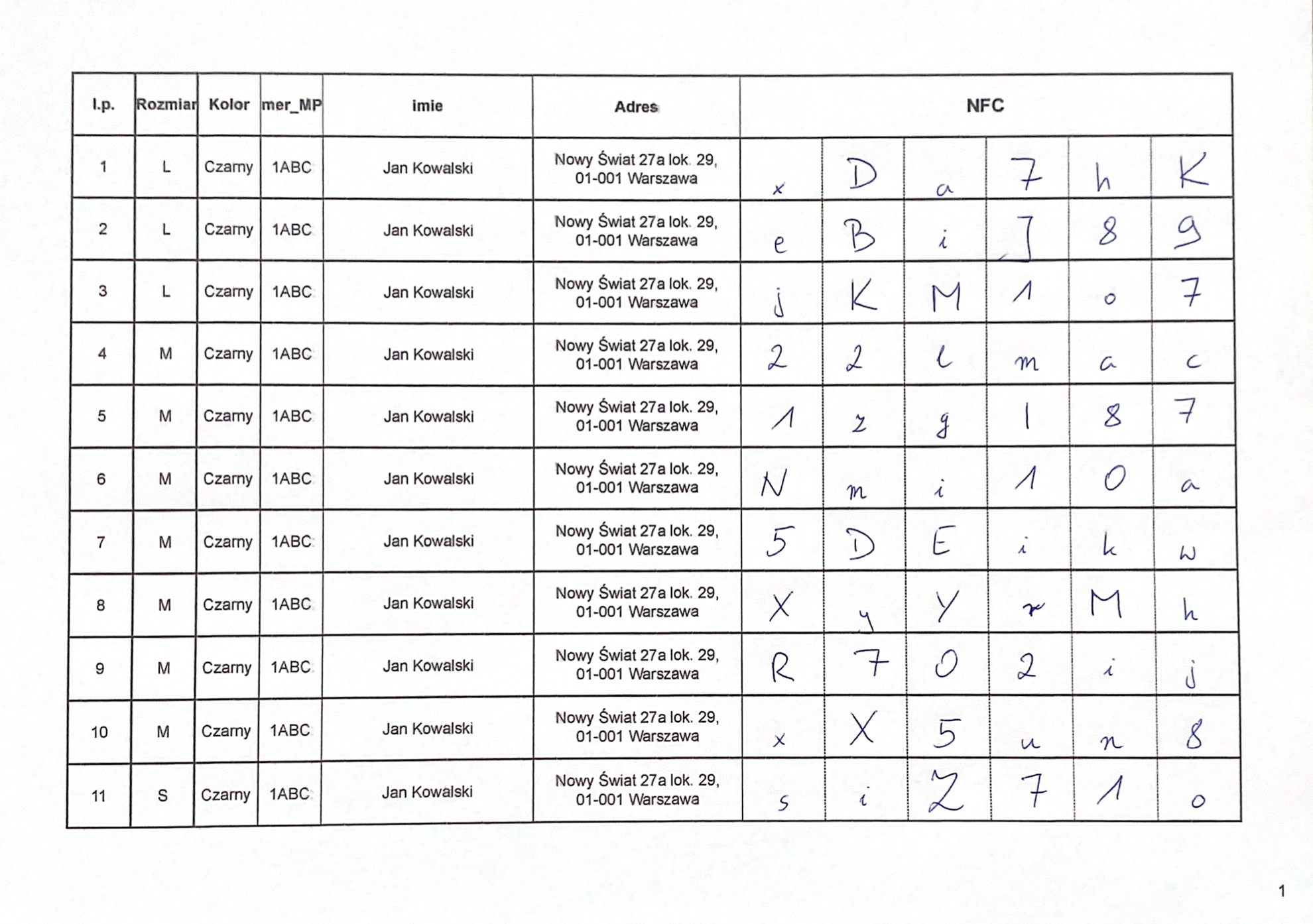 Końcowy proces produkcji bluz firmowych to zawsze konfekcja i logistyka. Dostawa bluz dla pracowników Budimex przypadała na grudzień, więc siłą rzeczy był to spersonalizowany prezent świąteczny. Ważne było dopilnowanie, żeby nie było pomyłek przy pakowaniu i wysyłkach. Każda bluza została oznaczona naklejką z imieniem, nazwiskiem oraz kontaktem jej właściciela. Dodatkowo do woreczka w woreczku z bluzą umieściliśmy karteczkę z kodem, który stanowił hasło do zalogowania się na stronę, do której prowadzi tag NFC. Kody przypisaliśmy do adresów mailowych pracowników, co było dla nas niestandardowym zadaniem, jednak udało się to wykonać z 99,88% dokładnością. Z całej partii jedynie trzy kody nie zgodziły się z listą, co sprawnie wyjaśniliśmy po dostawie i poprawiliśmy dane do logowania dla tych osób. Dla zobrazowania skali dokładności, jaką musieliśmy się wykazać poniżej wklejamy przykładowy dokument, na którym uzupełnialiśmy kody. Dane pracowników, adres oraz kody zostały zmyślone na potrzeby tego artykułu.